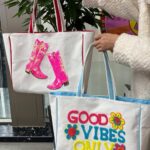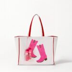 Step out in style with this chic Western-inspired tote. The design features a pair of glitzy pink cowboy boots shimmering with detailed sequin work. Framed by classic red piping and finished with tiered pink tassels, this bag perfectly captures the Coastal Cowgirl aesthetic. It’s a must-have for your next girl’s trip, brunch, or line-dancing night.
